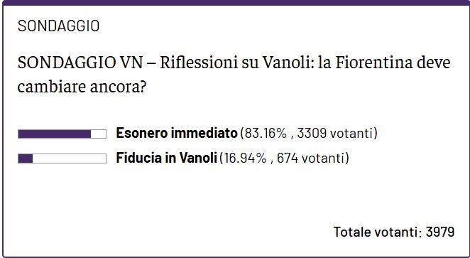 Il risultato è chiaro, la maggior parte dei tifosi vorrebbe l'immediato esonero di Vanoli (83,16), mentre la restante ha ancora fiducia nel tecnico, non ritenendolo un problema della Fiorentina