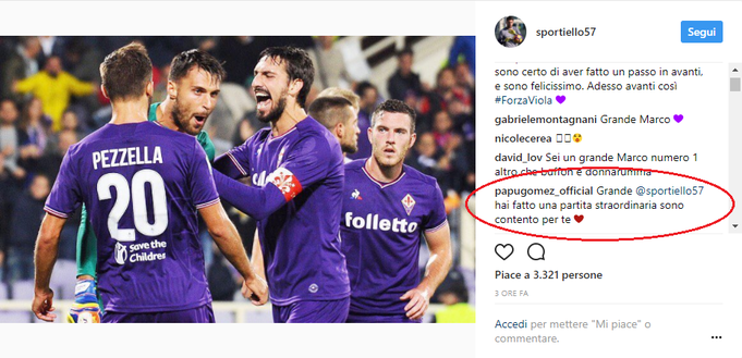 Tra i commenti troviamo anche quello del Papu Gomez, che ieri sera ha sbagliato un rigore parato proprio dallo stesso Sportiello: "Grande Sportiello. Hai fatto una partita straordinaria sono contento per te".