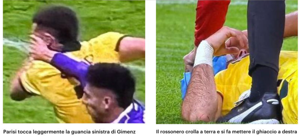 Al di là della valutazione tecnica, Rocchi — secondo quanto trapela — sottolineerà in modo critico il comportamento di Gimenez, accusato di una simulazione evidente. Le immagini mostrano come il contatto di Parisi sia stato minimo e sulla guancia sinistra dell’attaccante, mentre il giocatore si tocca e viene soccorso per un dolore alla parte destra del volto, un’incongruenza che rafforza l’ipotesi della simulazione.
