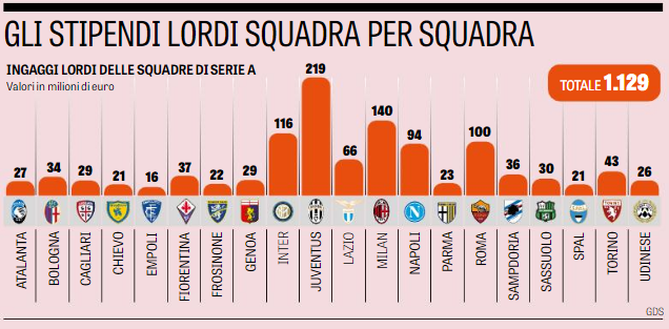 L'aumento del monte ingaggi? Non c'è stato. O meglio è stato minimo rispetto all'anno scorso. E da un punto di vista prettamente economico, la Fiorentina è fuori dalle prime sette del campionato, anche se poi naturalmente è il campo a fare la classifica. Con i suoi 37 milioni lordi complessivi si assesta all'ottavo posto in Serie A, ma decisamente più vicino alle squadre che le stanno dietro (+1 sulla Samp, +3 sul Bologna, +7 sul Sassuolo, +8 su Cagliari e Genoa) rispetto a quelle che la precedono (-6 rispetto al Torino, addirittura -29 rispetto alla Lazio sesta). Le prime? Non guardiamole nemmeno, visto che il solo Cristiano Ronaldo (31 milioni netti, circa 60 lordi) guadagna quasi il doppio dell'intera rosa viola.