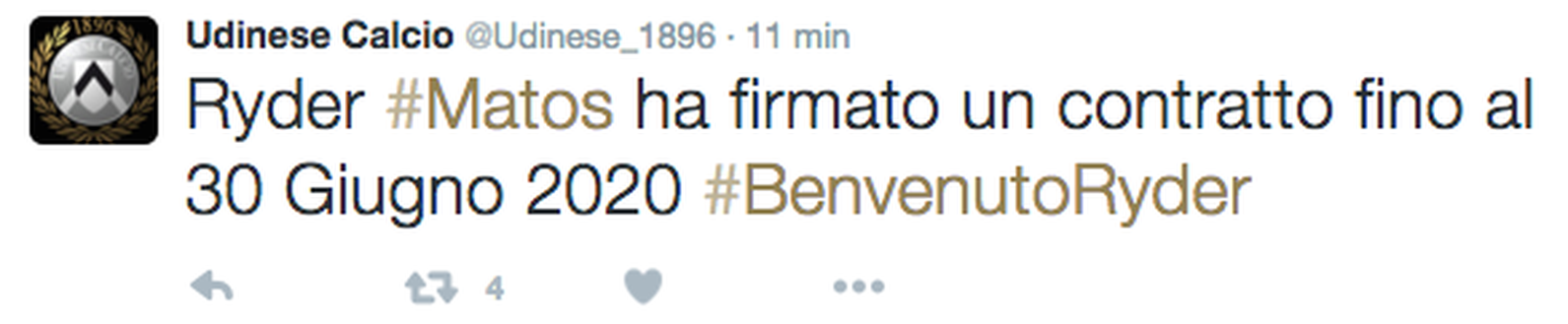 Ryder Matos passa all'Udinese a titolo definitivo, adesso è ufficiale. Per l'attaccante brasiliano contratto di 4 anni e mezzo con la società friulana. Su proprio sito ufficiale, il club bianconero conferma l'operazione con queste parole: "Udinese Calcio comunica di aver acquisito a titolo definitivo le prestazioni sportive dell'attaccante classe 1993 Ryder Matos dal club ACF Fiorentina. Il calciatore ha firmato un contratto fino al 30 Giugno 2020". Vi mostriamo anche il tweet con cui il club di Pozzo dà il benvenuto all'ex Carpi: