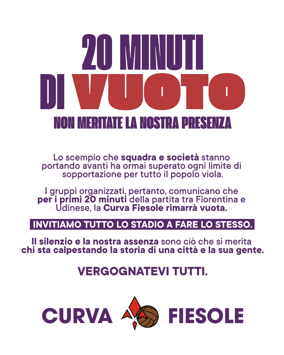 VIOLA NEWS news viola ultime notizie Curva Fiesole: “Contro l’Udinese 20 minuti di vuoto. Vergognatevi tutti”