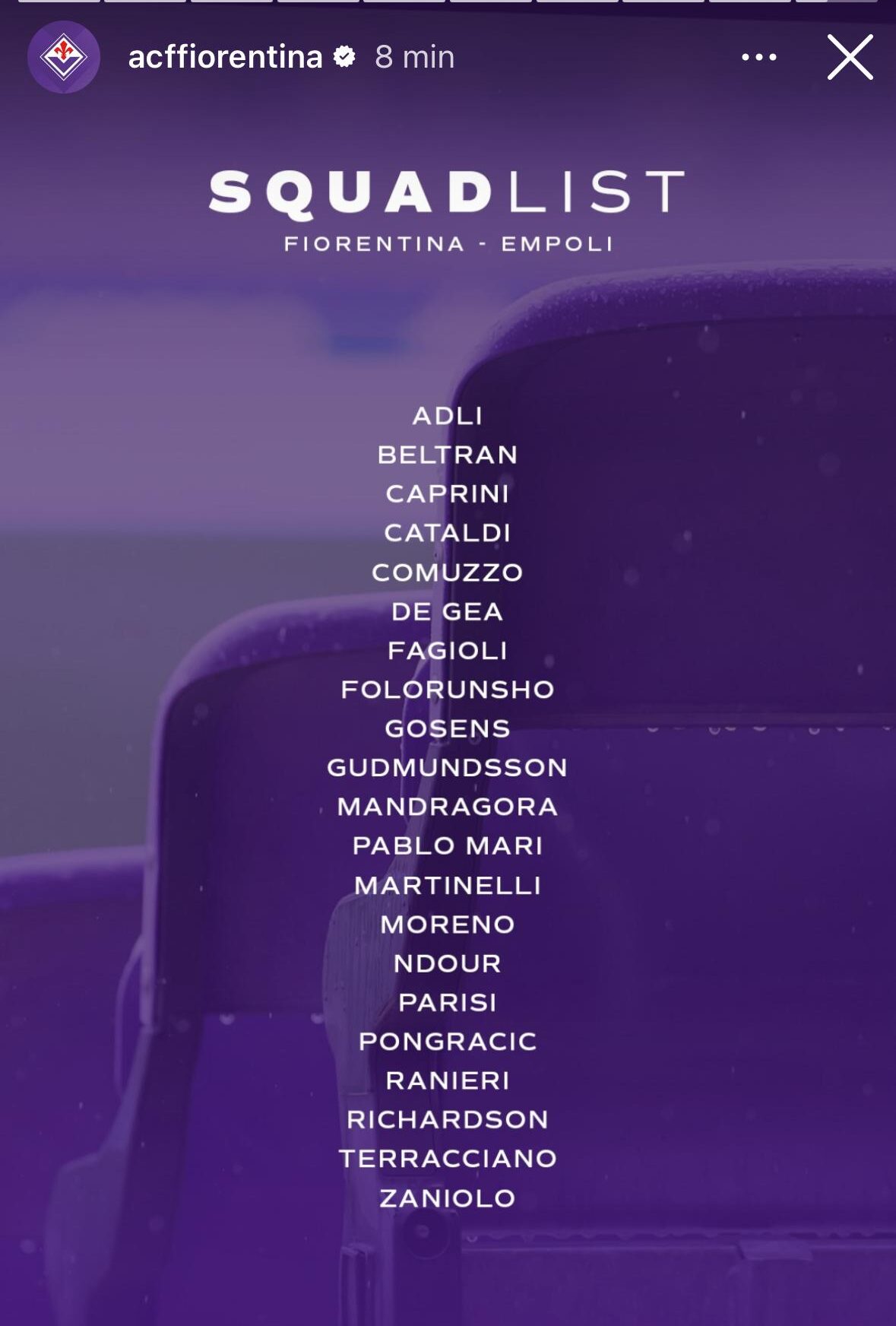E' stata da poco diramata la lista dei convocati della Fiorentina in vista della sfida di domani, ore 15:00, contro l'Empoli di D'Aversa