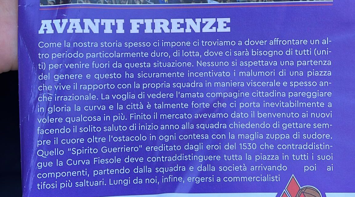 "Come la nostra storia spesso ci impone ci troviamo a dover affrontare un altro periodo particolarmente duro, di lotta, dove ci sarà bisogno di tutti (uniti) per venire fuori da questa situazione. Nessuno si aspettava una partenza del genere e questo ha sicuramente incentivato i malumori di una pazza che vive il rapporto con la propria squadra in maniera viscerale e spesso anche irrazionale. La voglia di vedere l'amata compagine cittadina pareggiare in gloria la curva e la città è talmente forte che ci porta inevitabilmente a volere qualcosa in più. Finito il mercato avevamo dato il benvenuto ai nuovi facendo il solito saluto di inizio anno alla squadra chiedendo di gettare sempre il cuore oltre l'ostacolo in ogni contesa con la maglia zuppa di sudore. Quello "Spirito Guerriero" ereditato dagli eroi del 1530 che contraddistingue la Curva Fiesole deve contraddistinguere tutta la piazza in tutti i suoi componenti, partendo dalla squadra e dalla società arrivando poi ai tifosi più saltuari. Lungi da noi, infine, ergersi a commercialisti o esperti di mercato, ogni considerazione in tal senso la lasciamo a chi vive GRAZIE alla Fiorentina e non a chi vive PER la Fiorentina, come noi. Detto questo però il senso di responsabilità per il ruolo che ricopriamo ci impone di vigilare e proteggere sempre gli interessi della nostra squadra da chi, per demeriti professionali e umani, non incarna in alcun modo lo spirito che contraddistingue chi ama i nostri colori.