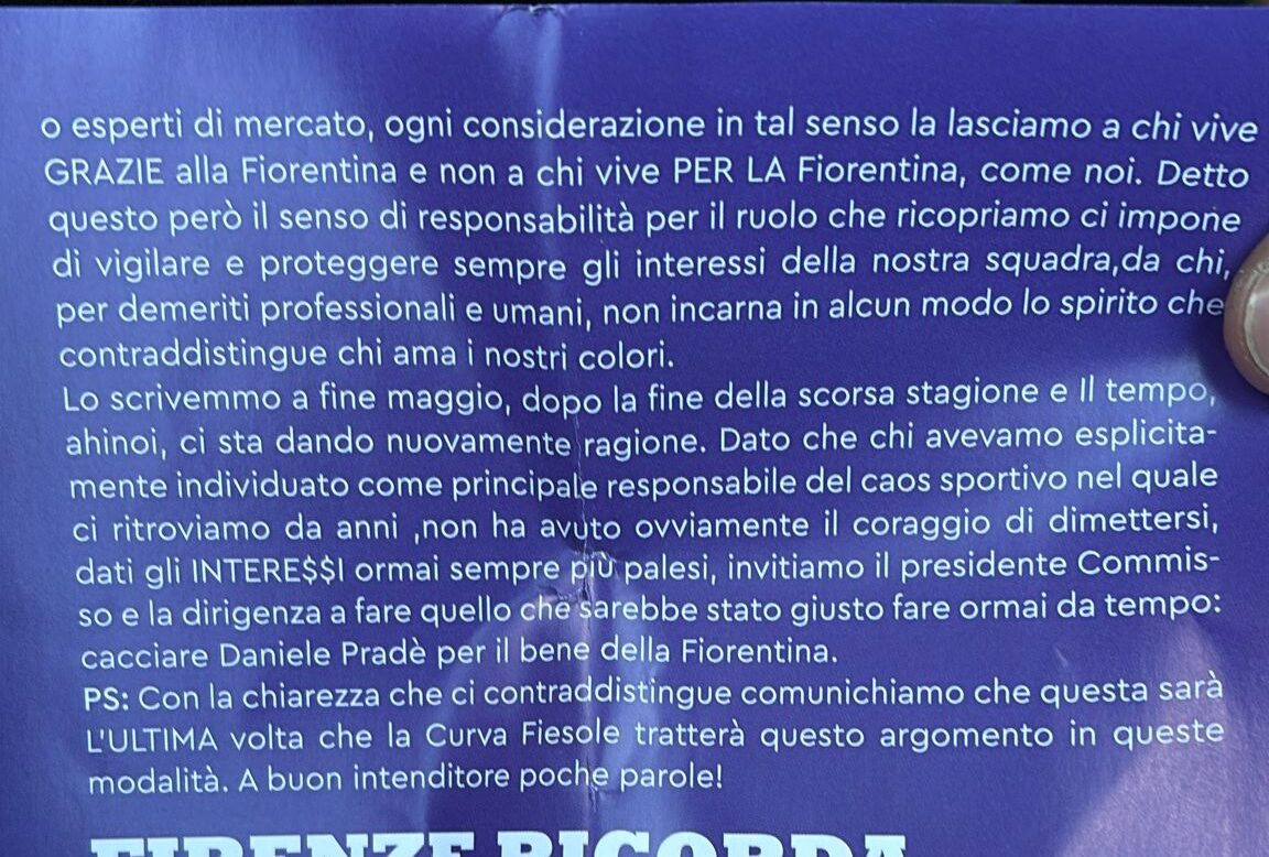 Un opuscolo distribuito in Curva Ferrovia, habitat della Fiesole da quando sono iniziati i lavori di restyling del Franchi, contiene un durissimo attacco da parte degli ultras viola nei confronti del direttore sportivo Daniele Pradè: