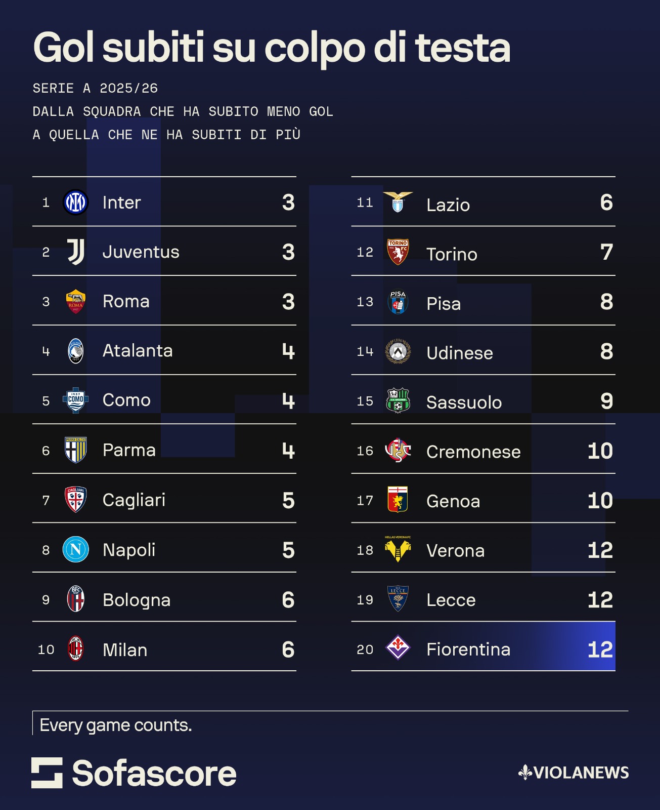 Vi proponiamo la classifica dei gol subiti di testa in campionato: la Fiorentina è ultima insieme a Lecce e Verona. Ieri l'ultimo caso