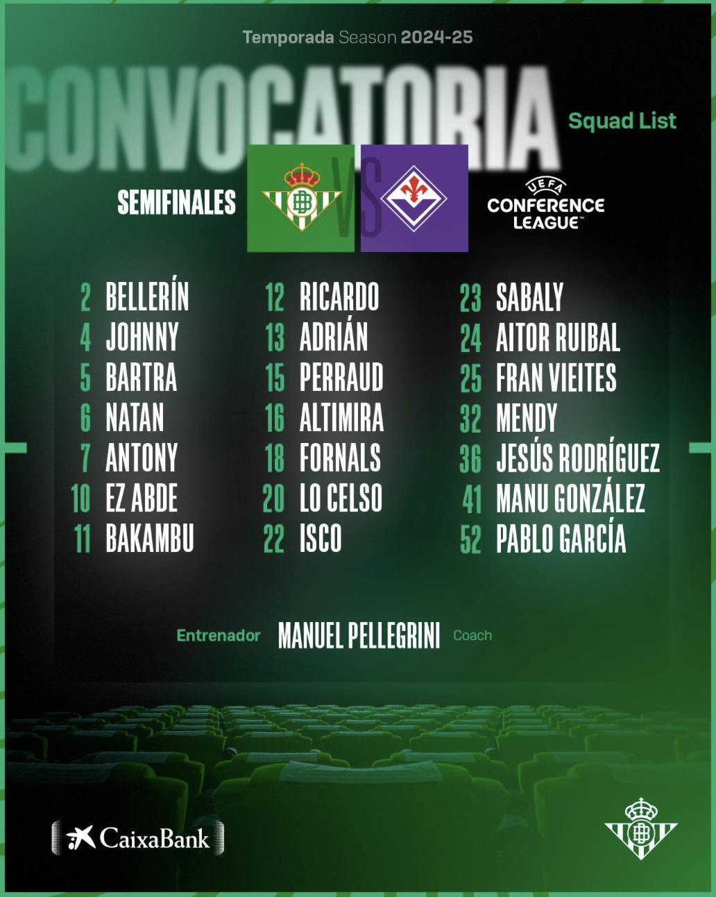 Il Real Betis ha reso nota la lista dei convocati per la sfida di domani contro la Fiorentina, valida per l’andata delle semifinali di UEFA Conference League, in programma allo stadio Benito Villamarín.