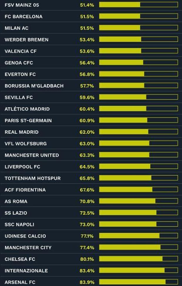 Uno studio del Cies, pubblicato oggi, evidenzia la percentuale di giocatori stranieri impiegati dai club europei negli ultimi 10 anni. Si scopre che la Fiorentina è al nono posto in Europa con una percentuale del 67,6%. Al primo posto in Europa c'è l'Arsenal seguita da Inter e Chelsea. Qui sotto la classifica completa: