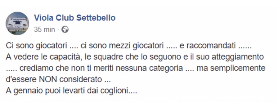 Questo il messaggio contro Giovanni Simeone apparso sulla pagina Facebook del Viola Club Settebello nonostante che il centravanti si sia scusato per il gesto: "Ci sono giocatori .... ci sono mezzi giocatori ..... e raccomandati ...... A vedere le capacità, le squadre che lo seguono e il suo atteggiamento ..... crediamo che non ti meriti nessuna categoria .... ma semplicemente d'essere NON considerato ... A gennaio puoi levarti dai coglioni....". Evidentemente allo storico club non bastano le scuse dell'argentino, i ragazzi da tantissimi anni parte integrante della Fiesole non hanno digerito il gesto del Cholito ed hanno così espresso tutto il loro disappunto sulla loro pagina Facebook