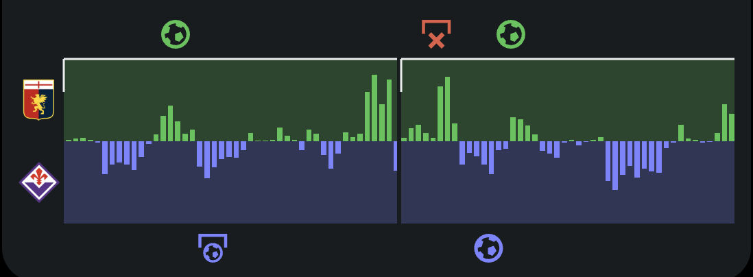 Genoa-Fiorentina è stata una partita ricca di colpi di scena e di errori da entrambe squadre.Contrariamente al solito la squadra viola ha giocato un secondo tempo tentando di imporre il proprio gioco per calare solo nella fase finale. il Genoa invece è stato più attivo a cavallo tra il primo e secondo tempo. Il grafico con l'analisi computerizzata di Sofascore ci dice questo con l'intensità del Genoa che è stata superiore (le canne d'organo più alte) di quella della Fiorentina.