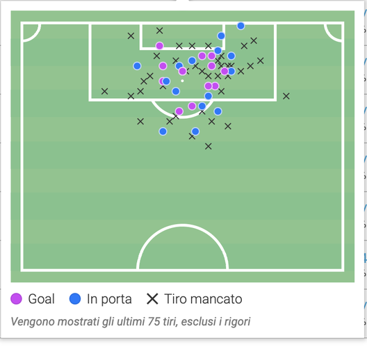 L'ex spezzino ha segnato 2 reti da fuori area ma il grosso dei suoi gol e dei suoi tiri arriva da dentro l'area di rigore