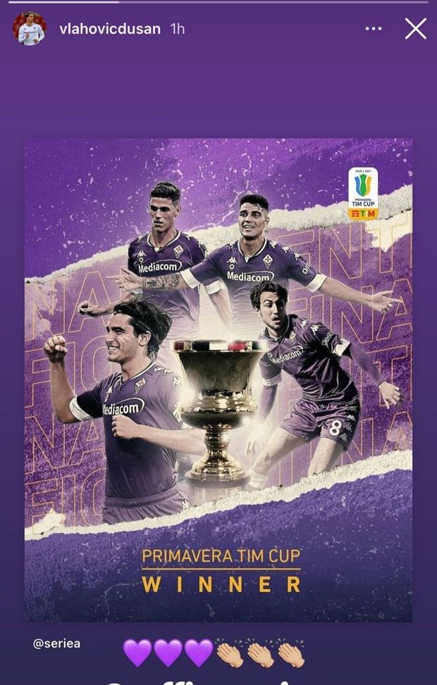 Con una storia su Instagram, Dusan Vlahovic ha voluto celebrare il successo viola nella Coppa Italia Primavera per il terzo anno consecutivo. Il serbo fu protagonista assoluto della prima di queste tre vittorie segnando tre reti nella doppia sfida contro il Torino. Questa la foto postata dall'attaccante classe 2000: