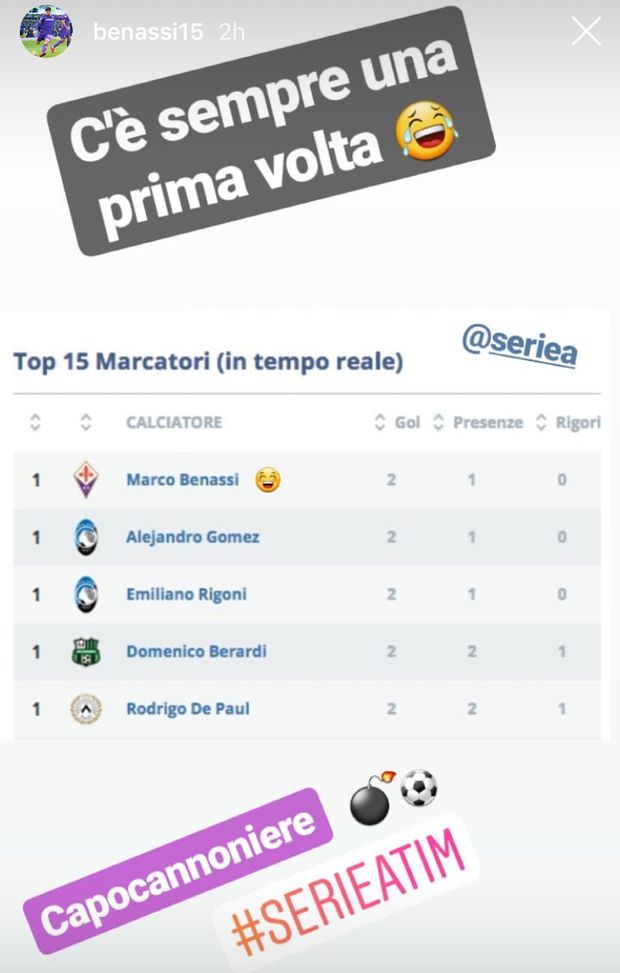 La doppietta contro il Chievo vale il primo posto nella classifica marcatori. Marco Benassi si gode il bel momento che sta vivendo anche sul suo profilo Instagram.
