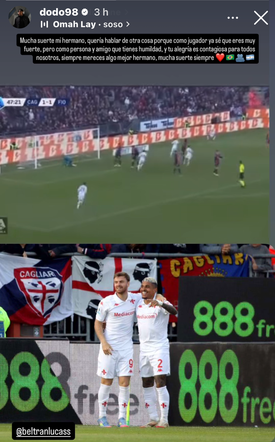 Lucas Beltran è passato in prestito al Valencia. Tra i compagni che hanno salutato l'attaccante c'è anche Dodò. Il terzino, attraverso una storia su Instagram, ha augurato il meglio all'ex compagno per la nuova avventura: