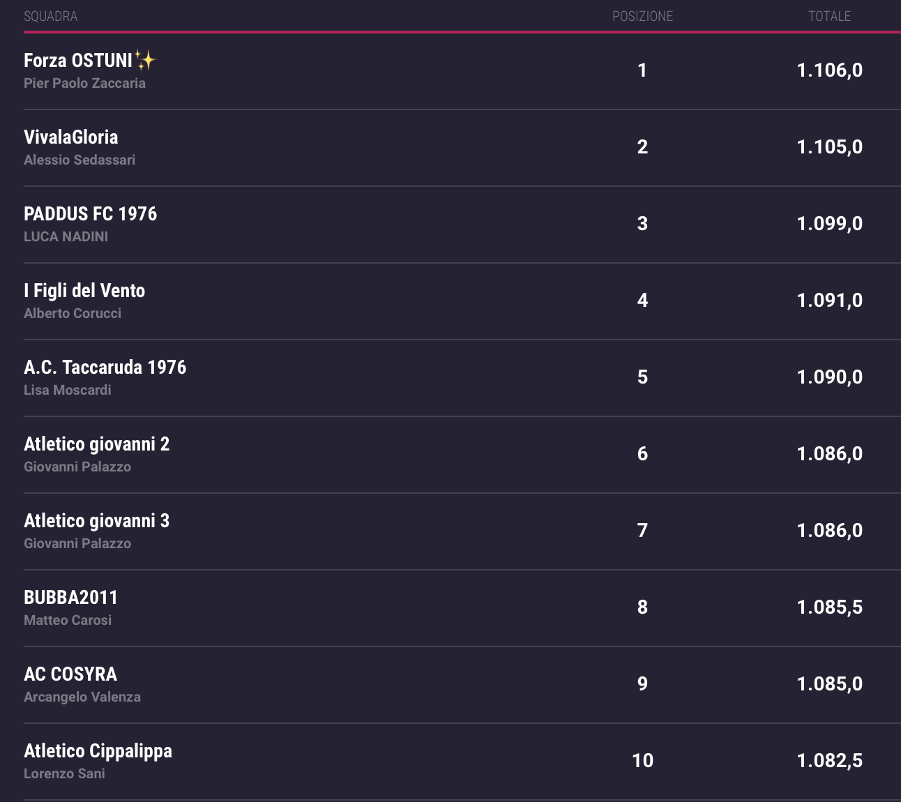 Qui sotto la classifica dei primissimi posti in classifica dopo la quattordicesima giornata della Violanews League, lega privata del Fantacampionato che ha 192 concorrenti. Nelle ultime partite le posizioni di testa sono cambiate molto spesso e adesso torna a condurre Forza OSTUNI che regolarmente si alterna con VivalaGloria che adesso è secondo. Alle loro spalle un gruppetto di squadre abbastanza staccate guidate da PADDUS FC 1976 che si è avvicinato molto ad duo di testa. Qui sotto la classifica dei primi 10 ma vi ricordiamo che potete sempre controllare la vostra posizione sulla pagina della Violanews League. Vi ricordiamo inoltre che il vincitore della nostra Lega riceverà un premio a sorpresa da parte della nostra redazione.
