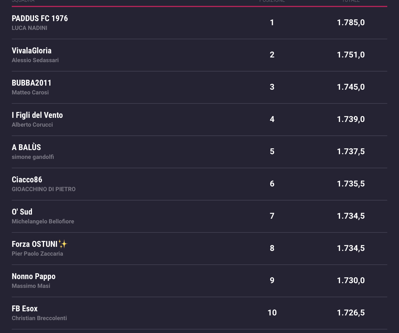 Qui sotto la classifica dei primissimi posti in classifica dopo la ventiduesima giornata della Violanews League, lega privata del Fantacampionato che ha 192 concorrenti. Nelle ultime partite le posizioni di testa sono cambiate molto spesso ma da qualche giornata PADDUS FC 1976 mantiene saldamente la testa della classifica adesso ha anche aumentato il distacco da VivalaGloria che è tallonato da BUBBA 2011 e I Figli del Vento. Perdono molte posizioni Forza OSTUNI e GOBBIUNSENEVOLE che esce dai primi 10. Qui sotto la classifica dei primi 10 ma vi ricordiamo che potete sempre controllare la vostra posizione sulla pagina della Violanews League. Vi ricordiamo inoltre che il vincitore della nostra Lega riceverà un premio a sorpresa da parte della nostra redazione.