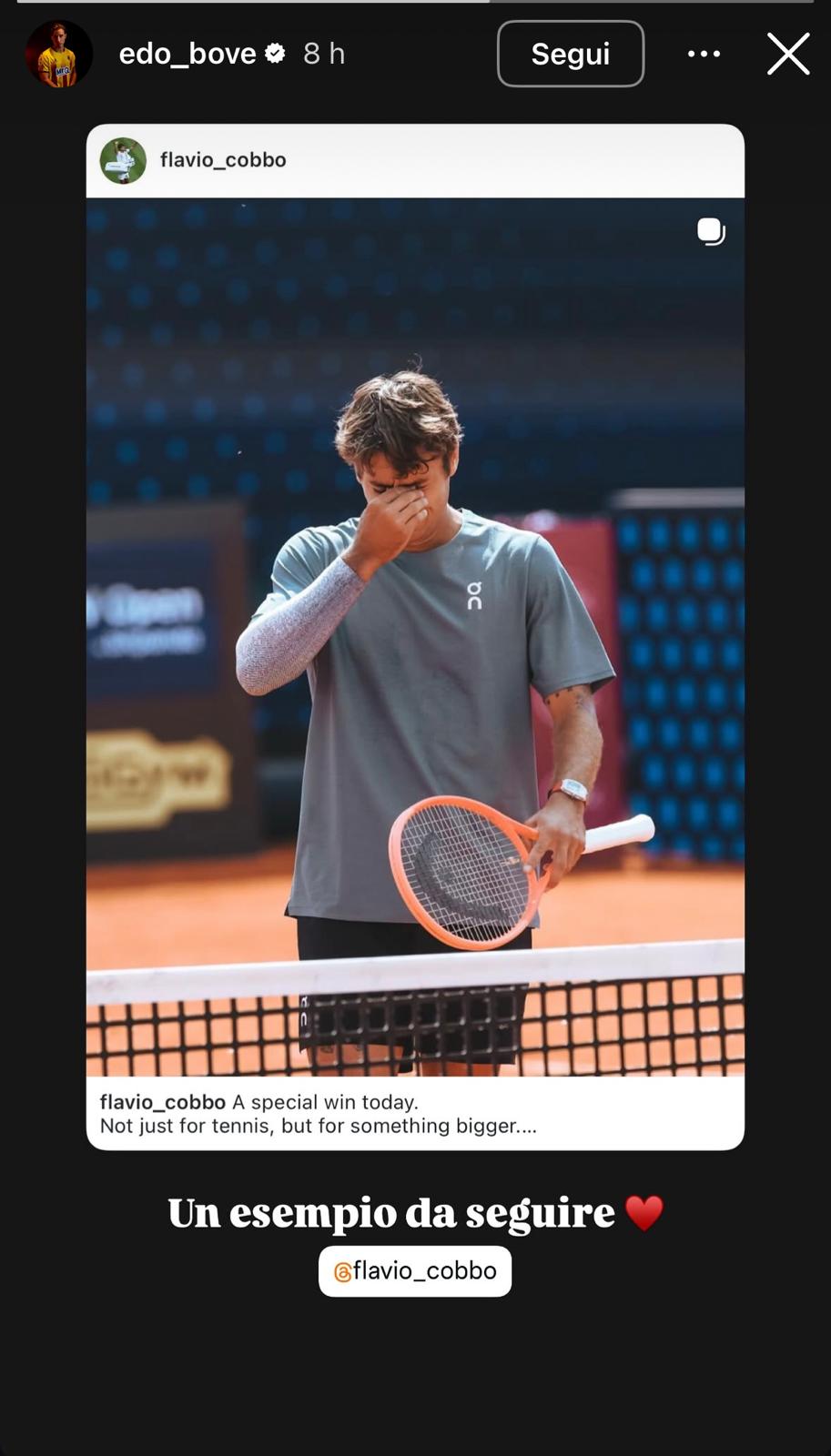 L'ex centrocampista della Fiorentina Edoardo Bove ha pubblicato una storia Instagram dove elogia l'amico tennista Flavio Cobolli. Il nativo di Firenze, infatti, ieri si era imposto sul tedesco Alexander Zverev conquistando la finale Atp 500 di Monaco di Baviera (l'azzurro ha perso in seguito contro Ben Shelton oggi per 6-2, 7-5), ma soprattutto Cobolli si era distinto per un grande gesto. Dopo la vittoria contro Zverev, infatti, aveva indicato il cielo scoppiando in un pianto con la testa nascosta nell'asciugamano. Un gesto per il giovane Mattia Maselli, scomparso ieri. "Una vittoria speciale oggi. Non solo per il tennis, ma per qualcosa di più grande. Pensando a Mattia, un ragazzo del mio club ai Parioli. Questa è per te" - aveva scritto in un post il tennista, con Bove che ha ricondiviso in una storia il pensiero di Flavio, scrivendo a sua volta: "Un esempio da seguire". Di seguito la foto.