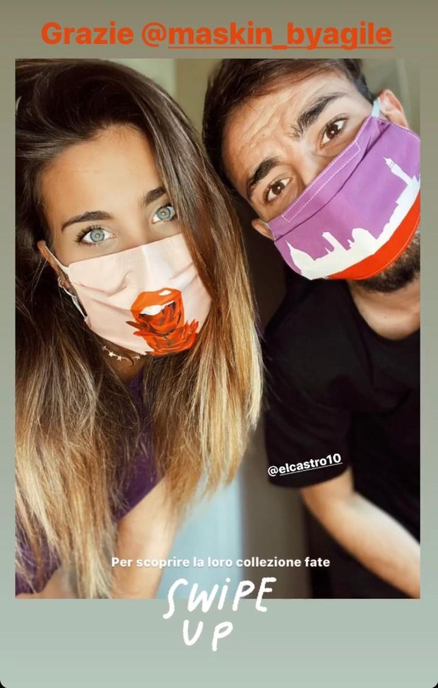 Bella foto di coppia, Rachele Risaliti ed il centrocampista viola Gaetano Castrovilli che esibisce una bella mascherina con lo skyline di Firenze.