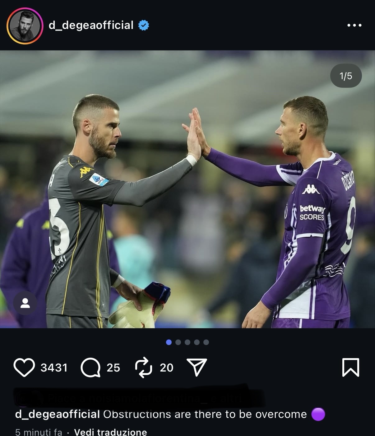 Uno dei leader della Fiorentina, David De Gea, ieri si è fatto sentire eccome in conferenza stampa. Le parole del portiere spagnolo sono risuonate nell'ambiente viola. L'ex Manchester United, sui social, ha voluto ribadire l'importanza di superare questo momento, postando delle foto su Instagram con sotto scritto: "Obstructions are there to be overcome", tradotto: "Gli ostacoli esistono per essere superati". Qui sotto la foto: