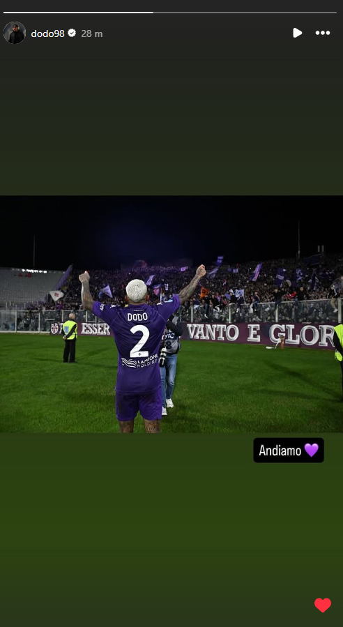L'esterno della Fiorentina, Dodò, dopo un inizio di stagione complicato, anche sotto il punto di vista delle prestazioni, sembra essere tornato quello di un tempo. Nei giorni scorsi si parlava di un calciatore a cui era sparito il solito sorriso, motivo che potrebbe essere derivato anche dei mancati risultati. Ma adesso, il brasiliano, suona la carica in vista della gara contro la Roma al Franchi con fischio d'inizio alle ore 15:00, pubblicando una storia sul suo profilo Instagram che lo ritrae di spalle mentre festeggia sotto la curva Ferrovia ed una scritta che dice "Andiamo" e viene seguita da un cuore viola. Di seguito l'immagine: