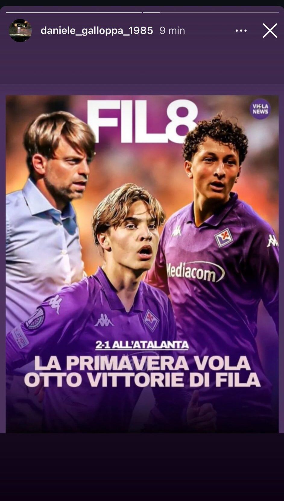 I tre punti ottenuti contro l'Atalanta allungano a otto il filotto di vittorie consecutive della Fiorentina Primavera di Daniele Galloppa. Lavoro, talento, tanto sudore: i ragazzi viola sognano. E il tecnico gongola, sul campo e... sui social, dove riposta una delle grafiche Instagram di Violanews.com.