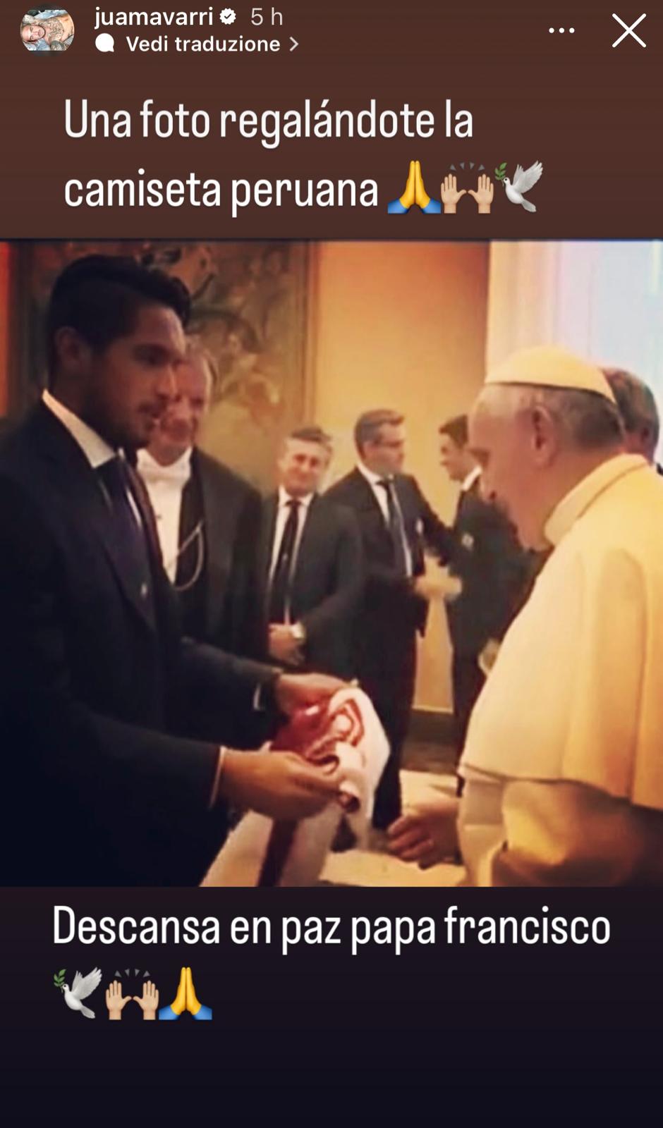 L'ex giocatore della Fiorentina Juan Manuel Vargas ha voluto ricordare, nel giorno della sua scomparsa, Papa Francesco. Lo ha fatto pubblicando una storia su Instagram che vi proponiamo di seguito, mentre qui la traduzione del testo: "Una foto di quando ti regalai la maglia peruviana. Riposa in pace Papa Francesco".