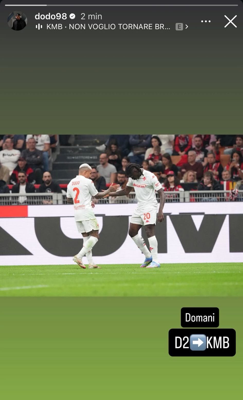 Anche in questa occasione non ha fatto mancare una storia Instagram per ufficializzare la ricomposizione della coppia formata da lui e da Moise Kean. La foto pubblicata dal brasiliano mostra una stretta di mano tra i due, proprio durante la gara dello scorso anno a San Siro contro il Milan, che finì 2-2, una grande prestazione di entrambi. L'Italiano realizzò la seconda rete viola e al brasiliano venne annullato il gol del 3-2 per la Fiorentina per una posizione di fuorigioco.