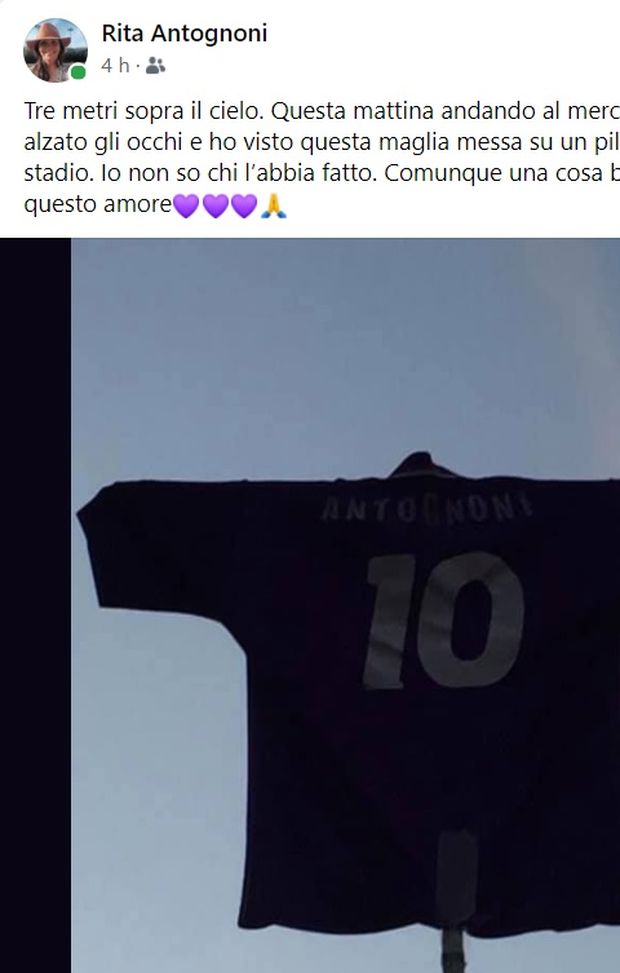 A raccoglierlo e amplificarlo è stata Rita Antognoni, moglie di Giancarlo. Questo il suo messaggio (corredato di foto) su Facebook: "Tre metri sopra il cielo. Questa mattina andando al mercato di Campo di Marte ho alzato gli occhi e ho visto questa maglia messa su un pilone della luce dentro lo stadio. Io non so chi l’abbia fatto. Comunque una cosa bellissima. Grazie per tutto questo amore".
