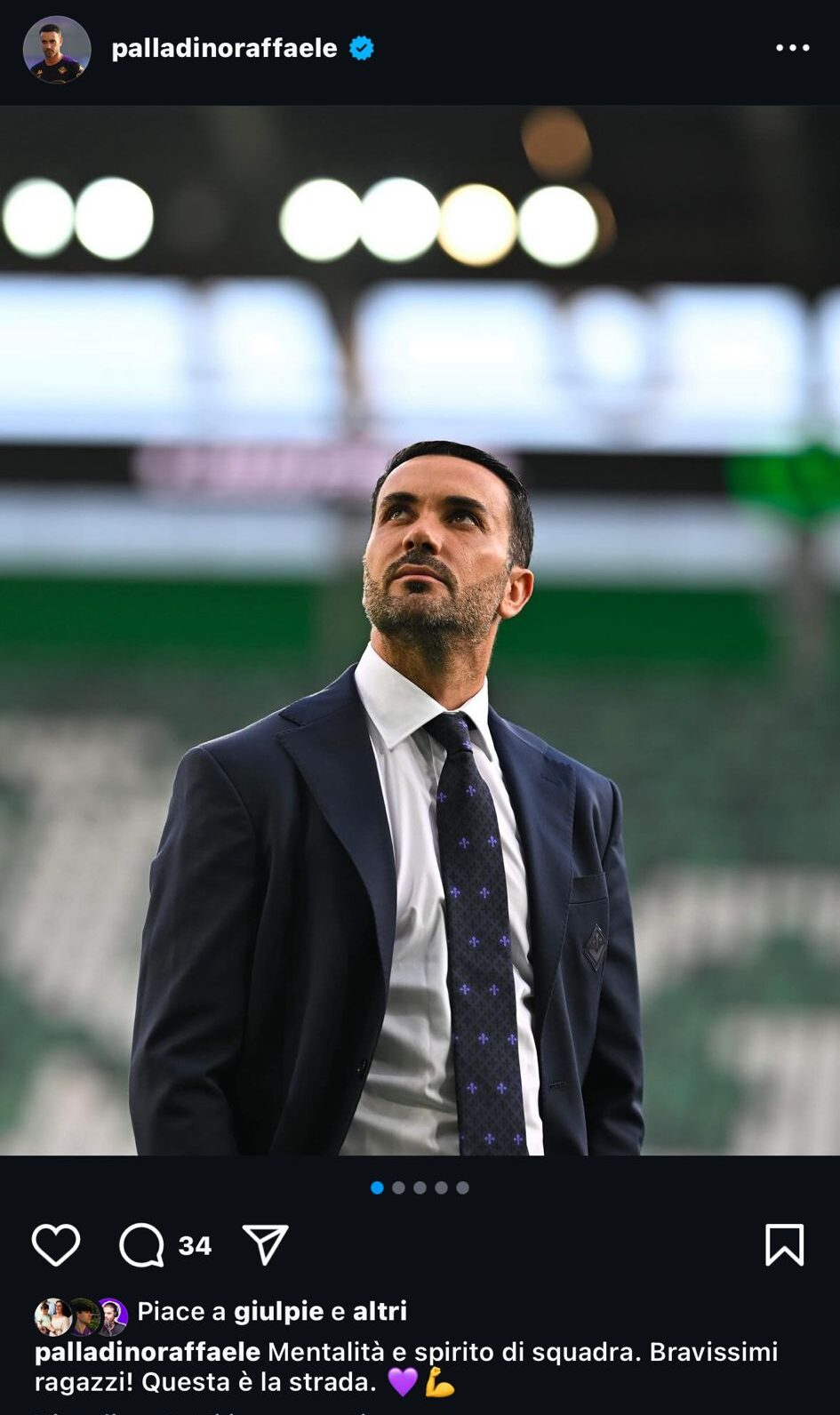 Raffaele Palladino dopo la vittoria sul San Gallo si è presentato davanti alle telecamere soddisfatto, non solo per il risultato ma soprattutto per l'atteggiamento dei giocatori "non titolari". Oggi tramite il suo profilo Instagram ha voluto applaudire la squadra con un post: "Mentalità e spirito di squadra. Bravissimi ragazzi! Questa è la strada". Insomma una descrizione che racchiude appieno il pensiero espresso ieri nel dopo gara in Svizzera. Adesso per Palladino e i suoi arriverà al Franchi il difficile test chiamato Roma.