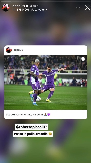 Dopo il successo di misura contro la Lazio, Dodò si è concesso un momento leggero sui social. Su Instagram ha pubblicato uno scatto insieme a Roberto Piccoli, accompagnandolo con una didascalia ironica: “Passami la palla fratello”. Il dettaglio divertente è che Piccoli sta per calciare il pallone.