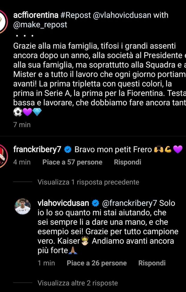 Che Franck Ribery possa essere un punto di riferimento per Dusan Vlahovic, questo era chiaro anche prima della tripletta del giovane attaccante serbo a Benevento. Stasera, però, dopo aver postato tutta la propria gioia, il numero 9 viola ha risposto ad un commento di Ribery. Vi proponiamo di seguito la schermata:
