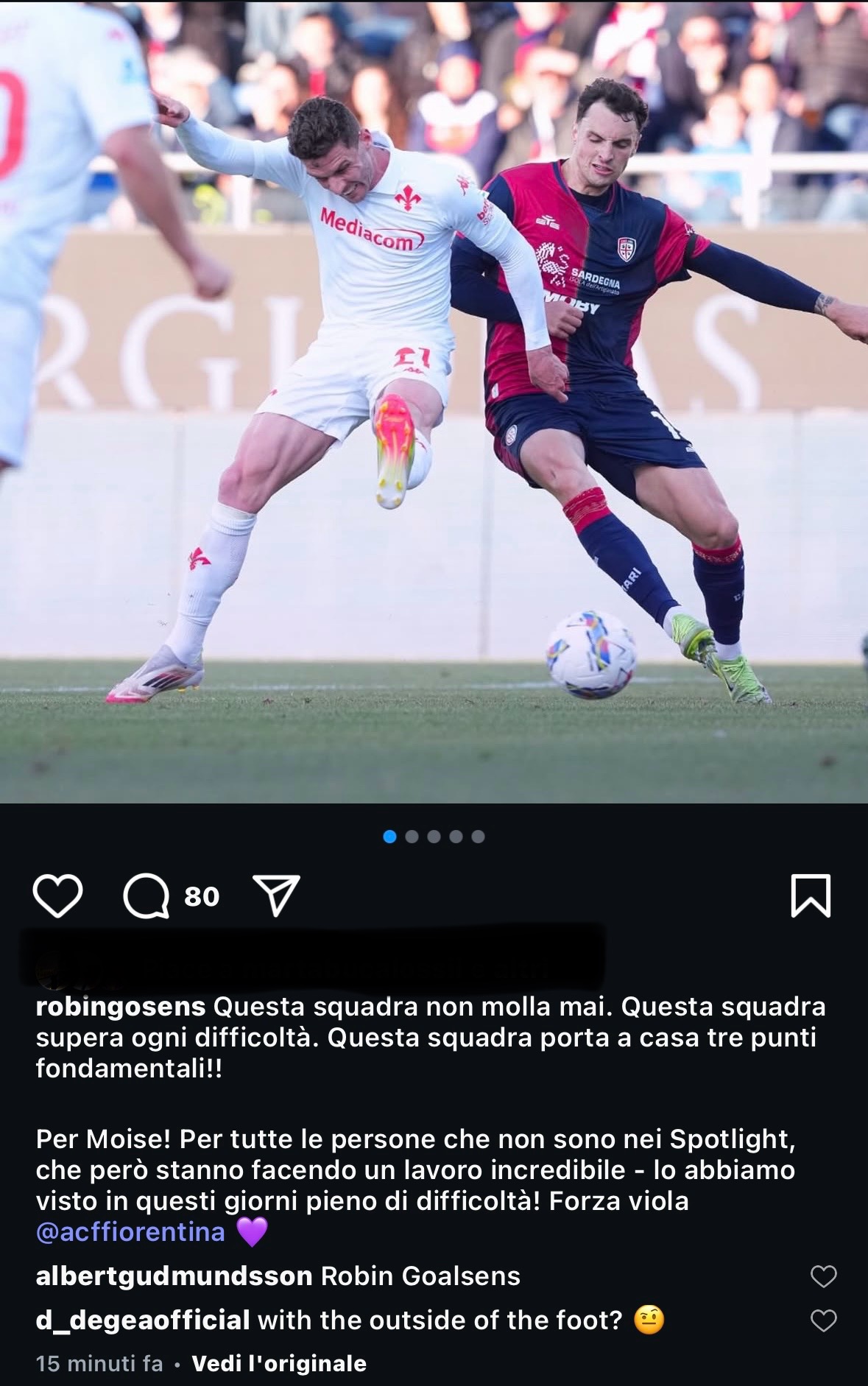 Sotto il post, il commento di Albert Gudmundsson: "Robin Goalsens". Il simpatico gioco di parole, visto i tanti gol segnati dal laterale tedesco in questa stagione. Qui sotto la foto del post e del commento