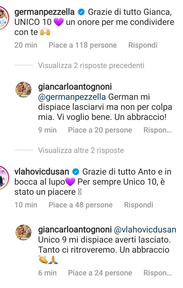 Poche parole ma che rispecchiano quella che è stata l'importanza di Giancarlo Antognoni per i giocatori viola. Sotto al saluto dell'Unico 10 su Instagram, German Pezzella e Dusan Vlahovic ringraziano l'ex club manager viola per gli anni trascorsi insieme, che all'argentino risponde: "Non è stata colpa mia" riguardo l'addio alla Fiorentina, mentre al bomber dice "Ci ritroveremo".