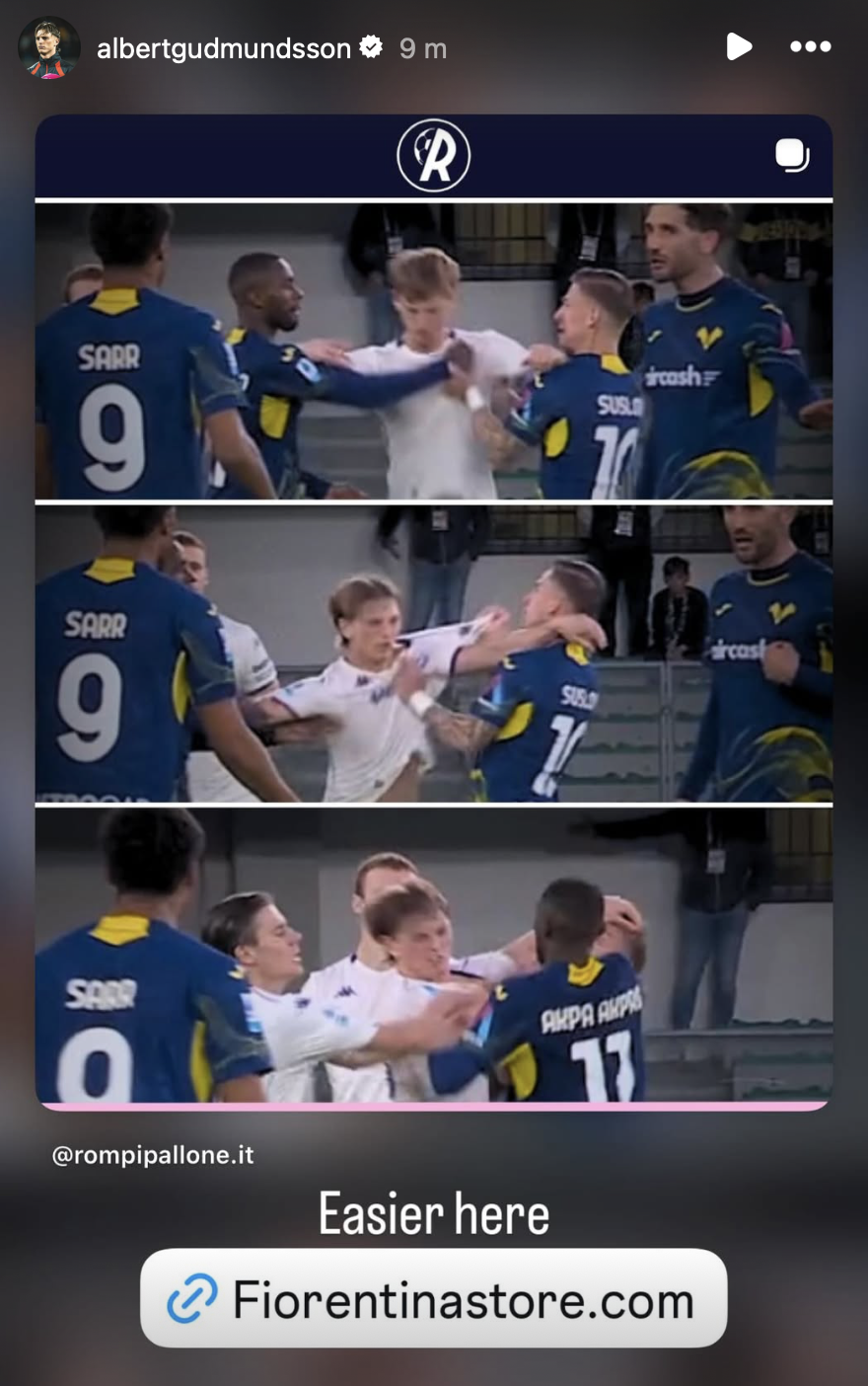 Un episodio che ha lasciato qualche strascico anche dopo il triplice fischio, ma che Gudmundsson ha scelto di commentare con ironia sui social. L’islandese ha infatti pubblicato una storia su Instagram con l’immagine del momento incriminato, accompagnata dalla scritta “Easier here” (“Più facile qui”) e dal tag al Fiorentina Store, in un chiaro riferimento alla maglia trattenuta durante il duello. Qui di seguito l'immagine: