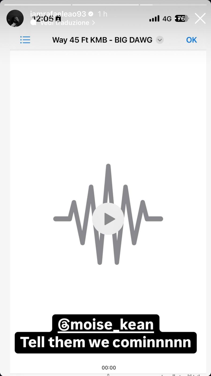 Moise Kean l'aveva raccontato: "Io e Leao faremo un disco insieme". I due sono infatti amici e condividono la passione per la musica (rap). E presto sarà pubblicato il loro featuring, come ha fatto intendere lo stesso Leao stamattina attraverso una storia instagram. L'attaccante del Milan - protagonista e marcatore ieri sera in Champions League contro lo Slovan Bratislava, ha infatti pubblicato lo screenshot di un file audio, salvato con i nomi d'arte dei due calciatori, Way 45 (Leao) e KMB (Kean), e dal titolo "Big Dawg" (grande amico). E poi la frase, con tag al centravanti della Fiorentina: "Dì loro che stiamo arrivando".