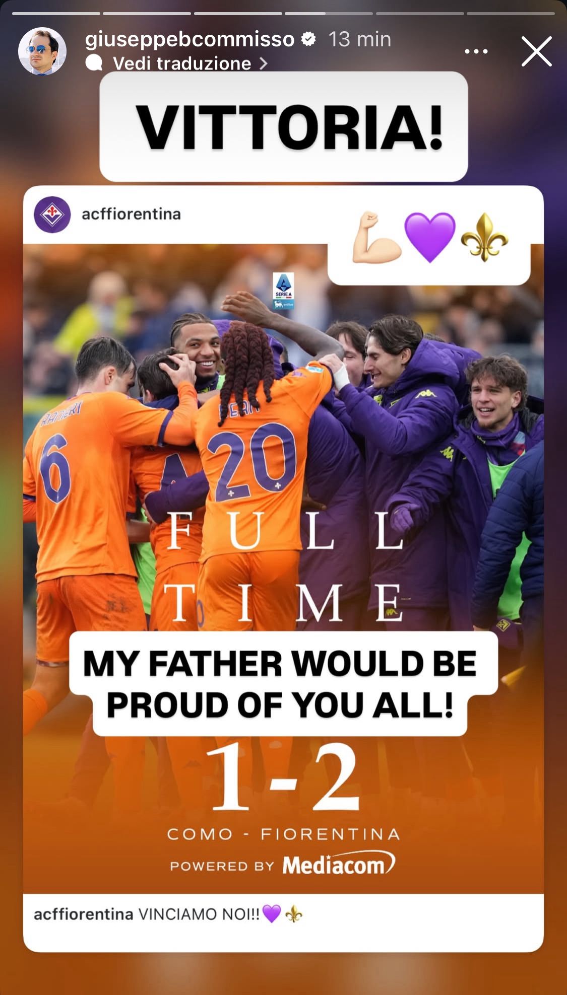 Il neo presidente della Fiorentina, Giuseppe Commisso, ha voluto celebrare la vittoria dei viola con un messaggio pubblicato sui propri canali social.
