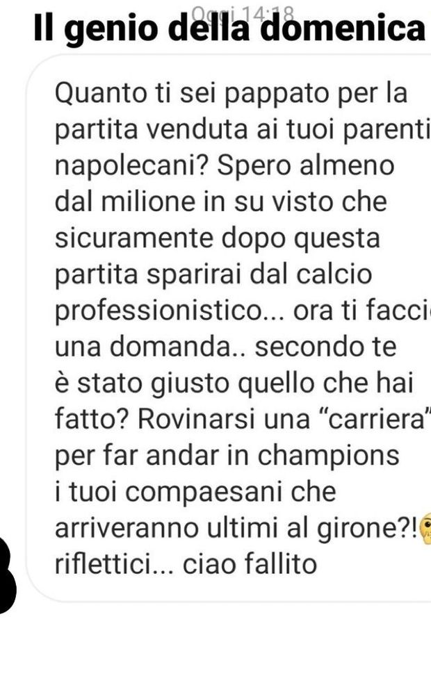 Il portiere della Fiorentina, Pietro Terracciano, ha pubblicato su Instagram una storia che mostra il messaggio ricevuto da un "tifoso" (juventino (?)) visibilmente stizzito per la vittoria dei partenopei in casa dei viola. Nel messaggio (visibile nella foto qui sotto) si accusa il portiere di aver venduto la partita di oggi in modo che il Napoli possa raggiungere la qualificazione alla Champions League. Il numero uno campano, tra l'altro migliore in campo della Fiorentina di oggi, si è limitato a commentare in tono sarcastico "il genio della domenica".