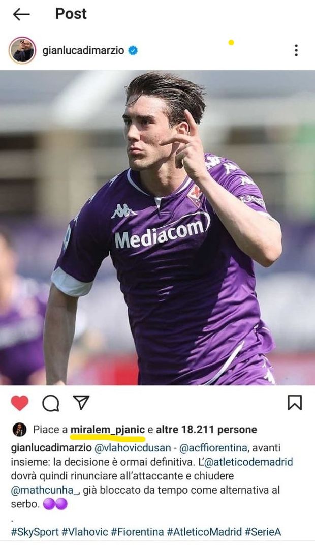 Ai tempi dei social si possono trarre indizi di mercato magari anche da un like. E' quanto successo in riferimento ad un post su Instagram dell'esperto di mercato Gianluca Di Marzio. Il giornalista di Sky Sport, facendo il punto della situazione relativa a Dusan Vlahovic ed alla decisione dell'Atletico di mollare la presa considerando le resistenze della Fiorentina, ha condiviso alcune righe di aggiornamento, apprezzate anche da Miralem Pjanic con un like dal suo profilo ufficiale. Che il centrocampista bosniaco si stia interessando particolarmente alle vicende viola? E che la permanenza di Vlahovic in riva all'Arno sia per lui un motivo ulteriore per decidere favorevolmente verso un suo eventuale trasferimento a Firenze?