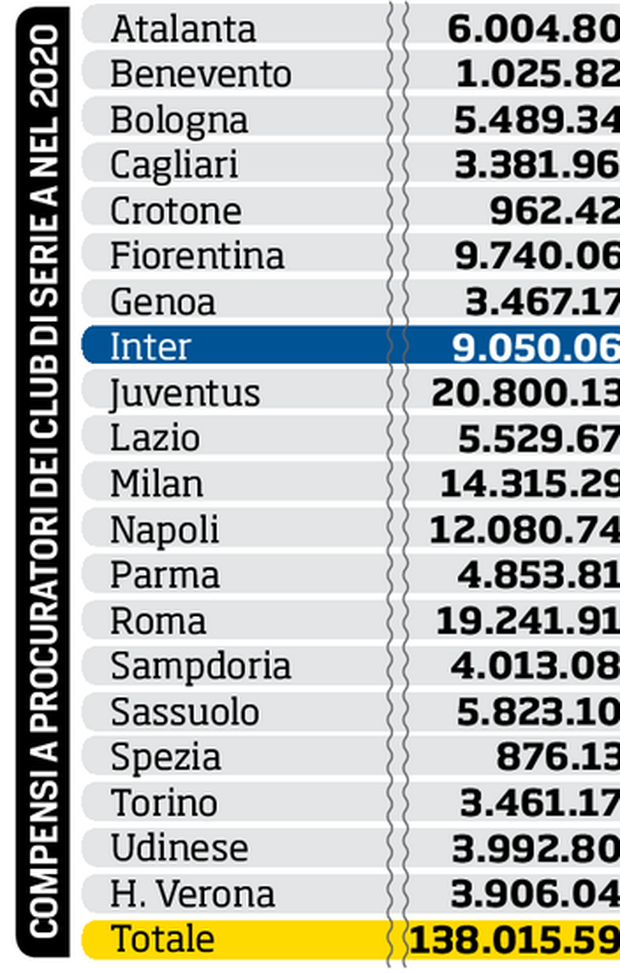Nel 2020 giù del 26% i compensi ai procuratori. Fiorentina vicina al podio