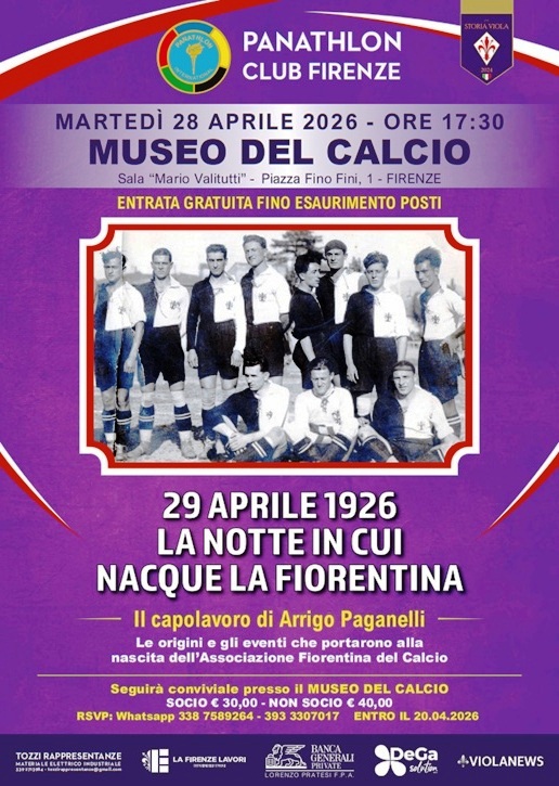 In occasione della importante ricorrenza del centenario della fondazione della Fiorentina, il Panathlon Club Firenze ha organizzato un esclusivo evento dal titolo “29 APRILE 1926, LA NOTTE IN CUI NACQUE LA FIORENTINA – Il capolavoro di Arrigo Paganelli. Le origini e gli eventi che portarono alla nascita dell’Associazione Fiorentina del Calcio”.