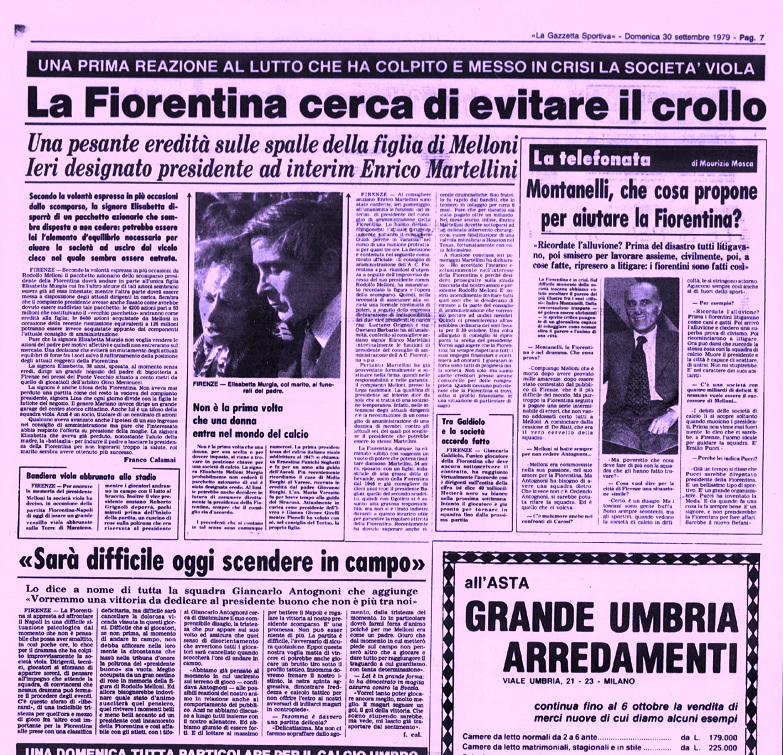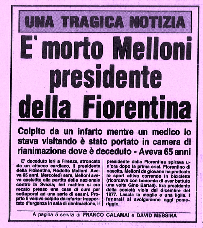 Rodolfo Melloni diventò dirigente della Fiorentina nel 1958 e venne eletto 11° presidente della storia gigliata il 15 dicembre 1977, subentrando a Ugolino Ugolini. Morì il 27 settembre 1979 in seguito ad un infarto. Il suo successore fu Enrico Martellini ---> PIER CESARE BARETTI