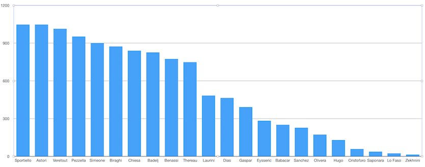 Dopo 11 partite di campionato sono 22 gli atleti che Pioli ha utilizzato, spesso insistendo sulla solita formazione tant'è che il grafico che vi mostriamo qui sotto è molto eloquente. Ci sono 10 calciatori che superano i 750 minuti di gioco che rappresentano il 71,5% del minutaggio complessivo. Poi troviamo Laurinie Gaspar che si dividono più o meno equamente i minuti anche se il francese ha preso il sopravvento e Dias che hanno un minutaggio medio e da Eysseric in giù gli altri 9 con meno di 283 minuti he rappresentano il 27% dell'impiego totale.