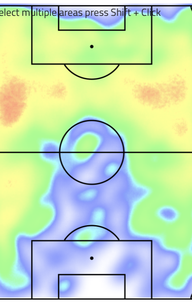 Il diagramma sottostante ci indica invece le zone del campo occupate più spesso da Politano (rosso maggiore occupazione - giallo intermedia - verde minore)